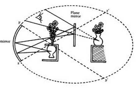 Ellie Ragland explains the lesson: "In Seminar One Lacan reproduced the drawing called 'the experiment of the reversed bouquet,' by which he illustrated the perceptual meeting of Real and Imaginary objects. in fact, he describes the phenomenon of mirage: a Real object is refracted by light rays and presents itself to the eye as if it were Real when, indeed, it is only virtual, or, as Lacan said, Imaginary. In the drawing the vase is Real and the bouquet in it is virtual. In the same way Real objects give rise to the Imaginary creation of similar--but not identical--objets. This conjunction between Real and Imaginary forms occasions the possibility for the free play in which introjection and expulsion alternate with projection and absorption to form the moi by identificatin with objects. The drawing of the reversed bouquet illustrates for Lacan the close inmixing of the Imaginary and Real worlds on a psychic plane" (Jacques Lacan and the Philosophy of Psychoanalysis).