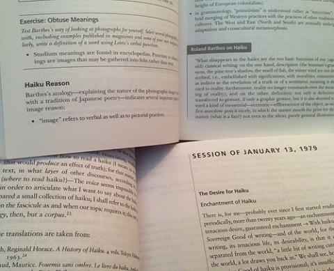 What questions would I have asked Barthes in 1980?  He was 63 when he started the course, and I was 36 that March (using Tarot reduction of numbers, both a 9).  I could not have asked him what I needed to know, but his lecture course, turns out to confirm posthumously the direction my work took.  Applied Grammatology (1985) took Derrida as the point of departure, but Teletheory (1989). is based primarily on Barthes's A Lover's Discourse: Fragments.  Internet Inventin (2003) introduced "image logic" through Barthes using Haiku poetry as the best poetics of photography, for generalizing image experience.  It turns out that the first lecture course in Preparatins for the Novel is devoted to Haiku (Barthes wrote Camera Lucida in the interval before the final seminar series).  These lectures do more than confirm commitments in the past to follow Barthes's lead.  Barthes's reflectinos on his "Vita Nova," his commitment to the search for a new mode of Writing "in the middle of his life" (which dates not chronologically but existentially), also is relevant to the search for a genre of konsult for Ubimage (a mode capable of supporting the convergence and integration of the modes separated in literacy:  knowledge, poetics, praxis).